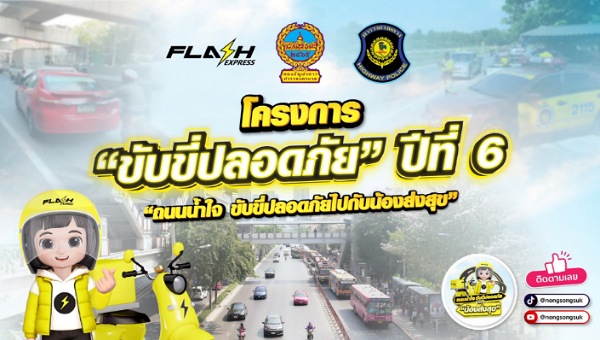 บริษัท แฟลช เอ็กซ์เพรส จำกัด ผู้นำด้านธุรกิจโลจิสติกส์ครบวงจรในไทยและเอเชียตะวันออกเฉียงใต้ ร่วมมือกับ กองบัญชาการตำรวจนครบาล (บช.น.) และ กองบังคับการตำรวจทางหลวง (บก.ทล.) เดินหน้าโครงการ “ขับขี่ปลอดภัย” สู่ปีที่ 6 ภายใต้แนวคิดใหม่ “ถนนน้ำใจ ขับขี่ปลอดภัยไปกับน้องส่งสุข” โดยปีนี้ได้ยกระดับการสื่อสารผ่าน วิดีโอคอนเทนต์ออนไลน์ เพื่อเข้าถึงคนรุ่นใหม่ พร้อมปลูกฝังวินัยจราจรในระยะยาวโดยโครงการนี้ดำเนินต่อเนื่องมาแล้วกว่า 5 ปี