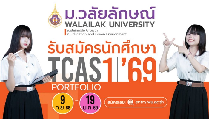 มหาวิทยาลัยวลัยลักษณ์ กำลังดำเนินการเปิดรับสมัครคัดเลือกบุคคลเพื่อเข้าศึกษาต่อในระดับปริญญาตรี ระบบ TCAS รอบที่ 1 Portfolio ประจำปีการศึกษา 2569 ผ่านเว็บไซต์ https://entry.wu.ac.th จำนวนรวมทั้งสิ้นกว่า 3,499 คน ตั้งแต่วันที่ 9 กันยายน 2568- 19 มกราคม 2569 โดยในรอบ Portfolio จะมีการเปิดรับสมัคร
