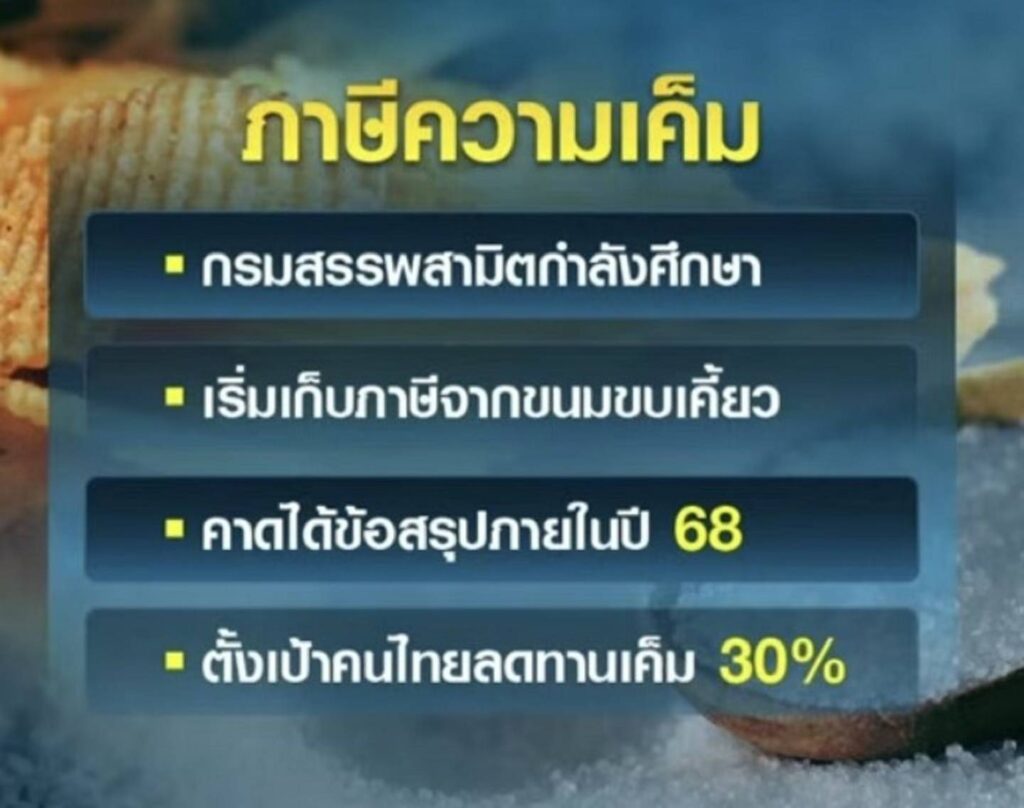 จากกรณีที่กรมสรรพสามิตมีแผนที่จะจัดเก็บภาษีความเค็มเนื่องจากคนไทยติดการบริโภคเค็มมากเกินไป โดยเริ่มจากสินค้าขนมขบเคี้ยวก่อน ซึ่งจะมีความชัดเจนในปี 2568 นี้ โดยกลุ่มขนมขบเคี้ยวจะถูกเก็บตามปริมาณโซเดียมต่อผลิตภัณฑ์ในอัตราภาษีแบบขั้นบันได โดยหวังให้ประชาชนบริโภคความเค็มลดน้อยลง โดยจะดำเนินการจัดเก็บภาษีความเค็มในรูปแบบเดียวกับภาษีความหวานซึ่งบังคับใช้ในประเทศไทยก่อนหน้านี้ในช่วงหลายปีที่ผ่านมาและส่งผลให้ประชาชนลดการบริโภคน้ำตาลลงชัดเจน โดยไม่ส่งผลกระทบต่อผู้ประกอบการธุรกิจ โดยรัฐตั้งเป้าหมายให้คนไทยลดการบริโภคเค็มให้ได้ร้อยละ 30 โดยก่อนหน้านี้ทางกระทรวงการคลังได้มีนโยบายและมอบหมายให้กรมสรรพสามิตไปศึกษาเรื่องกลไกการเก็บภาษีความเค็มในบางสินค้าที่มีอยู่ โดยเฉพาะการควบคุมสินค้าประเภทขนมขบเคี้ยว ซึ่งเป็นสินค้าที่ไม่กระทบต่อประชาชนส่วนใหญ่ ซึ่งเป้าหมายหลัก ๆ ของกระทรวงการคลังต้องการจะดูแลเรื่องสุขภาพของคนไทย ซึ่งจากข้อมูล 10 ปีที่ผ่านมา คนไทยก็ยังบริโภคเค็ม ซึ่งกระทรวงสาธารณสุขก็มีนโยบายเป็นหลักยุทธศาสตร์ที่จะพยายามให้คนไทยลดการบริโภคเค็มลง