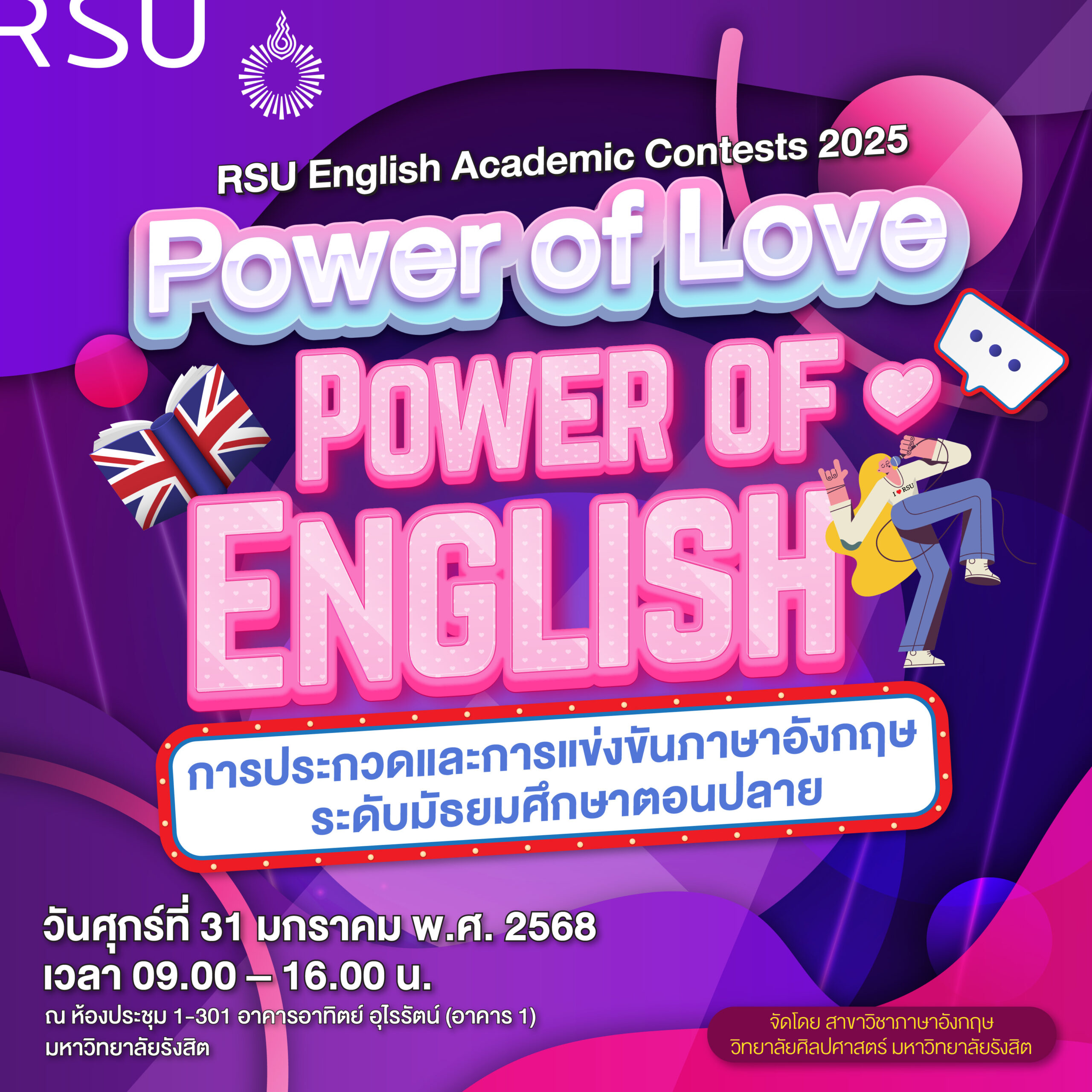 สาขาวิชาภาษาอังกฤษ วิทยาลัยศิลปศาสตร์ มหาวิทยาลัยรังสิต จัดกิจกรรม RSU English Academic Contests 2025 : Power of Love, Power of English การประกวดและการแข่งขันภาษาอังกฤษ ระดับมัธยมศึกษาตอนปลาย ในวันศุกร์ที่ 31 มกราคม พ.ศ.2568 เวลา 09.00 – 16.00 น. ณ ห้องประชุม 1-301 อาคารอาทิตย์ อุไรรัตน์ (อาคาร 1) มหาวิทยาลัยรังสิต ภายในงานพบกับการแข่งขันมากมาย อาทิ Speech Contest (ประกวดสุนทรพจน์) Singing Contest (ประกวดร้องเพลง) Culture Quiz (แข่งขันตอบปัญหาทางวัฒนธรรม) Drawing Contest (ประกวดวาดภาพ) และ Sandwich of Love Contest (ประกวดทำแซนด์วิช)