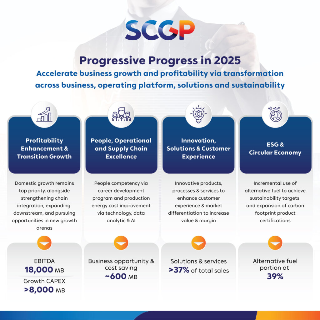ปี 2568 SCGP ได้วางแผนงบลงทุนรวม 13,000 ล้านบาท และตั้งเป้าเพิ่ม EBITDA เป็น 18,000 ล้านบาท โดยดำเนินงานผ่าน 4 กลยุทธ์หลัก เพื่อการเติบโตอย่างมีคุณภาพ ได้แก่ (1) เพิ่มความสามารถในการทำกำไรในกลุ่มประเทศอาเซียน โฟกัสการขายที่ตลาดภายในประเทศไทย อินโดนีเซีย เวียดนาม ฟิลิปปินส์ และสร้างการเติบโตในสินค้าเชื่อมโยงกับผู้บริโภค รวมถึงการเพิ่มโอกาสเข้าตลาดใหม่ ๆ ที่มีศักยภาพสูงอย่าง Healthcare Supplies (2) เพิ่มประสิทธิภาพการผลิตและห่วงโซ่อุปทาน การปรับปรุงต้นทุนการผลิต และเพิ่มประสิทธิภาพการใช้พลังงานผ่านเทคโนโลยี Data Analytic และ Artificial Intelligence (AI) ซึ่งคาดว่าจะเพิ่มโอกาสทางธุรกิจและลดต้นทุนในปี 2568 ได้ประมาณ 600 ล้านบาท (3) พัฒนานวัตกรรมและโซลูชันเพื่อสร้างความแตกต่างและตอบโจทย์ลูกค้า รวมถึงการพัฒนากระบวนการ และบริการ ยกระดับประสบการณ์ของลูกค้าและสร้างความแตกต่างเพื่อเพิ่มมูลค่าและความสามารถทำกำไร โดยตั้งงบประมาณและค่าใช้จ่ายเพื่อการวิจัยและพัฒนานวัตกรรมบรรจุภัณฑ์ คิดเป็นร้อยละ 1 โดยประมาณของรายได้ในแต่ละปี ซึ่งในปีนี้ตั้งเป้ารายได้จากกลุ่มสินค้านวัตกรรมและโซลูชัน คิดเป็นร้อยละ 37 ของรายได้รวม และ (4) มุ่งดำเนินงานตามกรอบ ESG และหลักเศรษฐกิจหมุนเวียน พร้อมพัฒนาผลิตภัณฑ์ที่ได้การรับรองคาร์บอนฟุตพริ้นท์ โดยวางเป้าหมายเพิ่มการใช้พลังงานทางเลือกเป็นร้อยละ 39 ในปี 2568