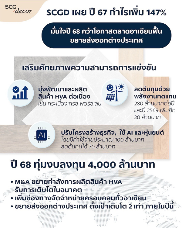 SCGD เผยผลประกอบการปี 2567 กำไร 810 ล้านบาท เพิ่มขึ้น 147% สวนกระแสตลาดอาเซียนชะลอตัวจากการปรับโครงสร้างธุรกิจ-กระบวนการผลิต เสริมศักยภาพการแข่งขันโดย 1.) พัฒนาและผลิตสินค้ามูลค่าเพิ่มต่อเนื่อง 2.) ลงทุนพลังงานทดแทนเพื่อลดต้นทุน 3.) ใช้เทคโนโลยี AI และหุ่นยนต์ ปี 2568 พร้อมรับตลาดอาเซียนฟื้น ตั้งงบลงทุน 4,000 ล้านบาท ขยายกำลังการผลิตสินค้า HVAเพิ่มช่องทางจำหน่ายทั่วอาเซียน และลุยส่งออกต่างประเทศ ตั้งเป้ารายได้โต 5% จ่ายปันผลต่อเนื่อง