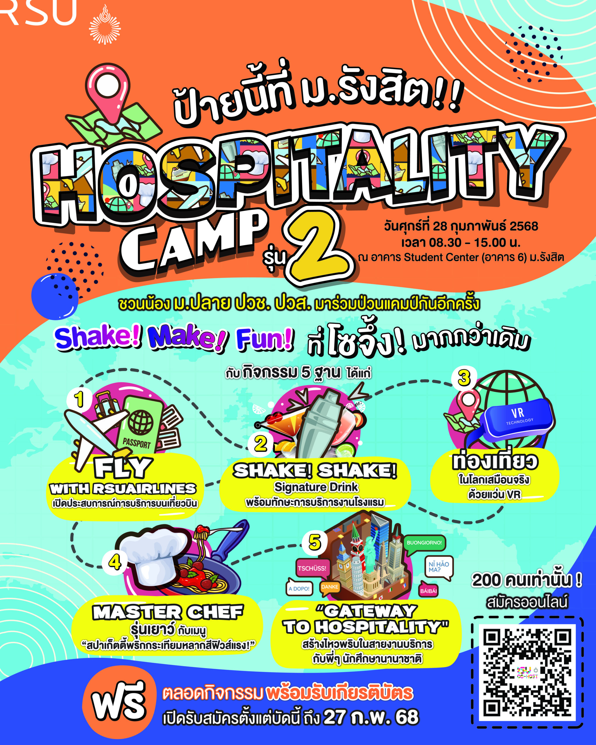 วิทยาลัยการท่องเที่ยวและอุตสาหกรรมการบริการ มหาวิทยาลัยรังสิต เปิดรับสมัครน้องนักเรียนมัธยมศึกษาตอนปลาย ปวช. ปวส. ร่วมกิจกรรม Hospitality Camp (รุ่น 2) จัดขึ้นในวันศุกร์ที่ 28 กุมภาพันธ์ 2568 เวลา 08.30 – 15.00 น. ณ อาคาร Student Center (อาคาร 6) มหาวิทยาลัยรังสิต