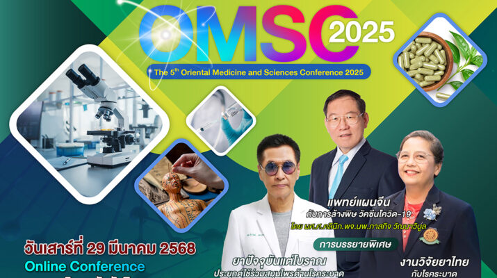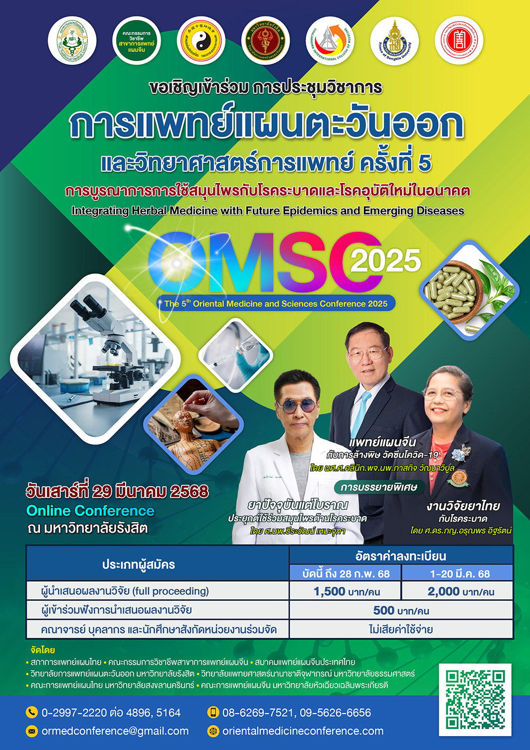 วิทยาลัยการแพทย์แผนตะวันออก มหาวิทยาลัยรังสิต ขอเชิญผู้ที่สนใจสมัครเข้าร่วมงานและนำเสนอผลงานวิจัยในการประชุมวิชาการการแพทย์แผนตะวันออกและวิทยาศาสตร์การแพทย์ ครั้งที่ 5 (The 5th Oriental Medicine and Sciences Conference 2025) OMSC 2025 “การบูรณาการณ์การใช้สมุนไพรกับโรคระบาดและโรคอุบัติใหม่ในอนาคต” Integrating Herbal Medicine with Future Epidemics and Emerging Diseases ในวันเสาร์ที่ 29 มีนาคม 2568 รูปแบบออนไลน์ (Online Conference) ณ มหาวิทยาลัยรังสิต