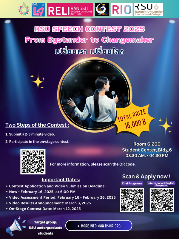 วิทยาลัยนานาชาติ ร่วมด้วย สถาบันภาษาอังกฤษ วิทยาลัยศิลปศาสตร์ สถาบัน Gen.ed และสำนักนานาชาติ มหาวิทยาลัยรังสิต จัดกิจกรรม RSU Speech Contest 2025: From Bystander to Changemaker: เปลี่ยนเรา เปลี่ยนโลก ในวันพุธที่ 12 มีนาคม 2568 เวลา 08.30 – 16.30 น. ณ ห้องออดิทอเรียม 6-200 อาคาร Student Center (อาคาร 6) มหาวิทยาลัยรังสิต สำหรับผู้ที่สนใจสามารถสอบถามรายละเอียดเพิ่มเติมได้ที่ วิทยาลัยนานาชาติ มหาวิทยาลัยรังสิต โทร 02 791 6000 ต่อ 4012 หรือ 4019