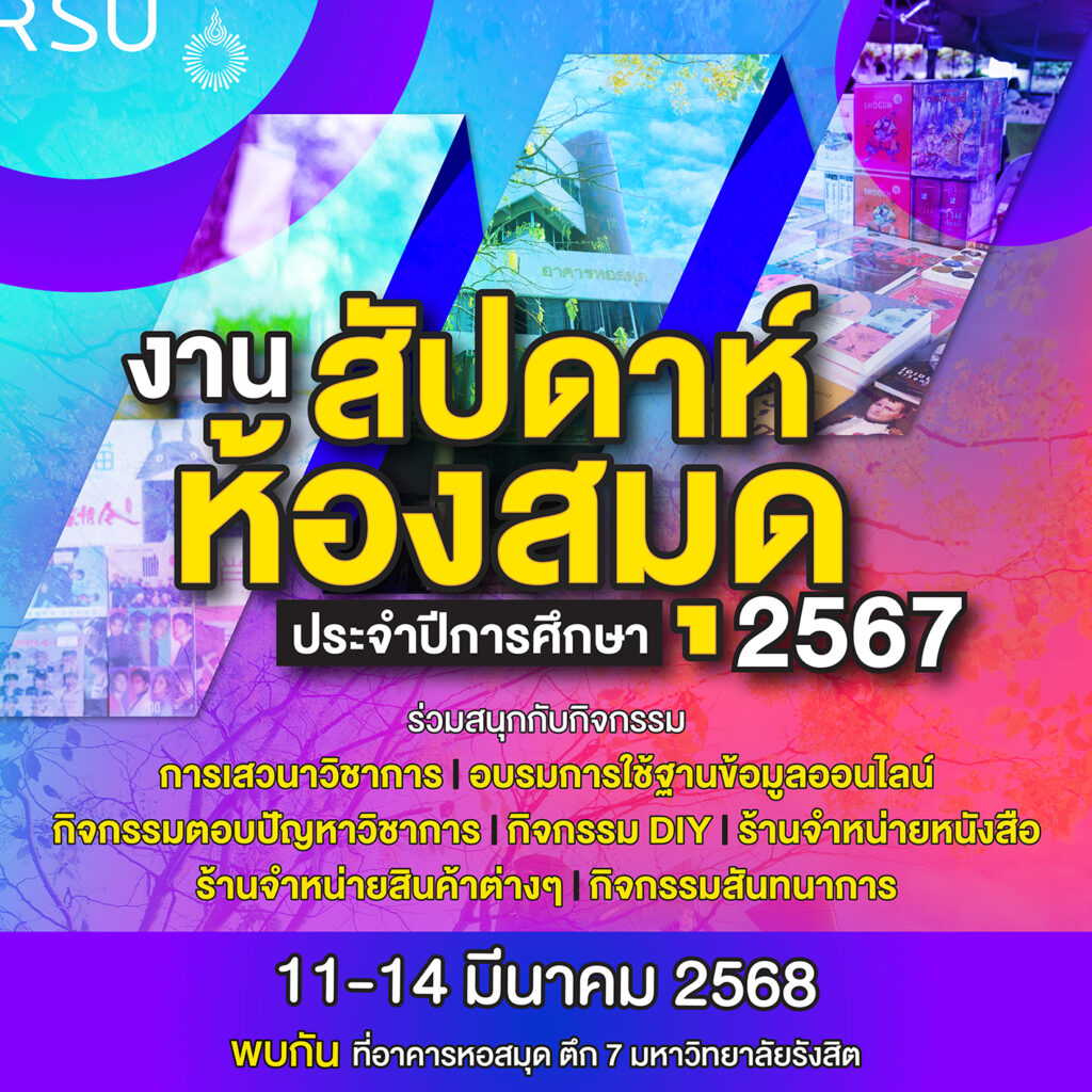 สำนักหอสมุด มหาวิทยาลัยรังสิต จัดงานสัปดาห์ห้องสมุด ประจำปีการศึกษา 2567 ระหว่างวันที่ 11- 14 มีนาคม 2568 เวลา 09.00 – 19.00 น. ณ อาคารหอสมุด มหาวิทยาลัยรังสิต โดยได้รับเกียรติจาก ดร.อรรถวิท อุไรรัตน์ อธิการบดีมหาวิทยาลัยรังสิต เป็นประธานเปิดงาน