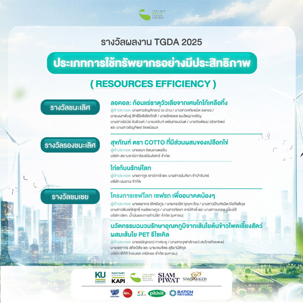 พิธีมอบรางวัล Thailand Green Design Awards 2025 สถาบันค้นคว้าและพัฒนาผลิตผลทางการเกษตรและอุตสาหกรรมเกษตร มหาวิทยาลัยเกษตรศาสตร์ จัดประกวดผลิตภัณฑ์ที่เป็นมิตรต่อสิ่งแวดล้อม Thailand Green Design Awards 2025 ในงานเกษตรแฟร์ ประจำปี 2568 โดยมุ่งเน้นความคิดสร้างสรรค์ในการผลิตผลิตภัณฑ์อย่างเป็นระบบ เน้นนวัตกรรมที่เป็นมิตรต่อสิ่งแวดล้อม ให้ความสำคัญกับปัญหาขยะที่ทวีความรุนแรงเพิ่มมากขึ้น รวมไปถึงการออกแบบและพัฒนาผลงานที่ยกระดับคุณภาพการใช้ชีวิตภายใต้สภาวการณ์ปัจจุบัน การส่งเสริมการใช้ประโยชน์ทรัพยากรชีวภาพ และการสร้างสังคมที่ยั่งยืนด้วยการมีส่วนร่วมในทุกภาคส่วน และปลูกจิตสำนึกด้านสิ่งแวดล้อมและร่วมสร้างสรรค์ผลิตภัณฑ์จากวัสดุธรรมชาติ และมีกระบวนการผลิตที่เป็นมิตรต่อสิ่งแวดล้อม ทั้งในเรื่องการเผยแพร่เอกลักษณ์ด้านสิ่งแวดล้อมและเป็นมหาวิทยาลัยสีเขียว (KU Green Campus) ซึ่งแบ่งออกเป็นการมอบรางวัลผลงานประเภทประหยัดพลังงาน (Energy Saving) รางวัลผลงานประเภทการใช้ทรัพยากรอย่างมีประสิทธิภาพ (Resource Efficiency) รางวัลผลงานประเภทที่ช่วยยกระดับคุณภาพการใช้ชีวิต (Life Enhancement) รางวัล TGDA Student Design Awards 2025 รางวัล ODS (Object of Desire Store) และรางวัลเกียรติยศ Honorary Awards