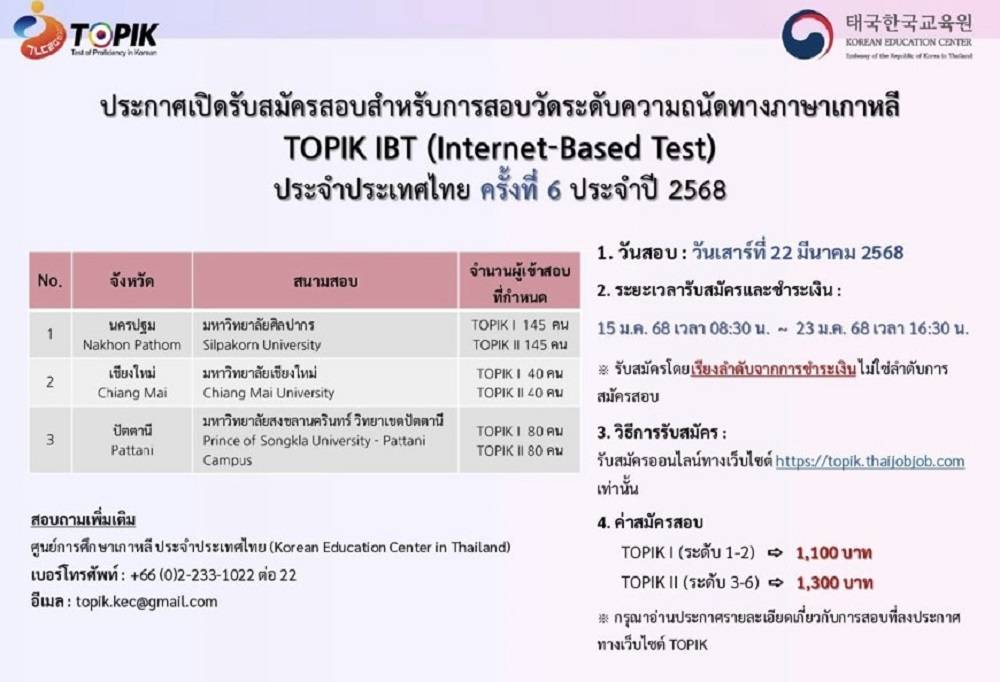 เมื่อวันที่ 22 มีนาคม 2568 ที่ผ่านมา ศูนย์การศึกษาเกาหลี ประจำประเทศไทย ได้เปิดการสมัครสอบ Topik1 (1,100บาท/คน) และ Topik2 (1,300 บาท/คน) โดยเป็นการสอบวัดระดับทางภาษาเกาหลี(Topik PBT) ประจำปี 2568 โดยมีจำนวนผู้เข้าสอบและสถานที่เข้าสอบ จำนวน 3 สนามสอบประกอบด้วย 1.มหาวิทยาลัยศิลปากร จังหวัดนครปฐม แบ่งเป็น Topik1 จำนวน 145 คน และ Topik2 จำนวน 145 คน 2.มหาวิทยาลัยเชียงใหม่ จังหวัดเชียงใหม่ แบ่งเป็น Topik1 จำนวน 40 คน และ Topik2 จำนวน 40 คน และ มหาวิทยาลัยสงขลานครินทร์ วิทยาเขตปัตตานี แบ่งเป็น Topik1 จำนวน 80 คน และ Topik2 จำนวน 80 คน โดยการชำระเงินค่าสมัครสอบชำระผ่านแอพลิเคชันธนาคารโดยระบบ Thai QR Payment เท่านั้น(ไม่สามารถชำระทางเคาน์เตอร์ธนาคารหรือบัตรเครดิตได้) โดยในส่วนของเว็บไซต์ https://topik.thaijobjob.com/ แจ้งว่า หากมีข้อสงสัย หรือมีต้องการติดต่อสอบถามโดยตรงได้ที่เบอร์ 02-257-7159(ต่อ 3) หรือ 02-233-1022 (ต่อ22)