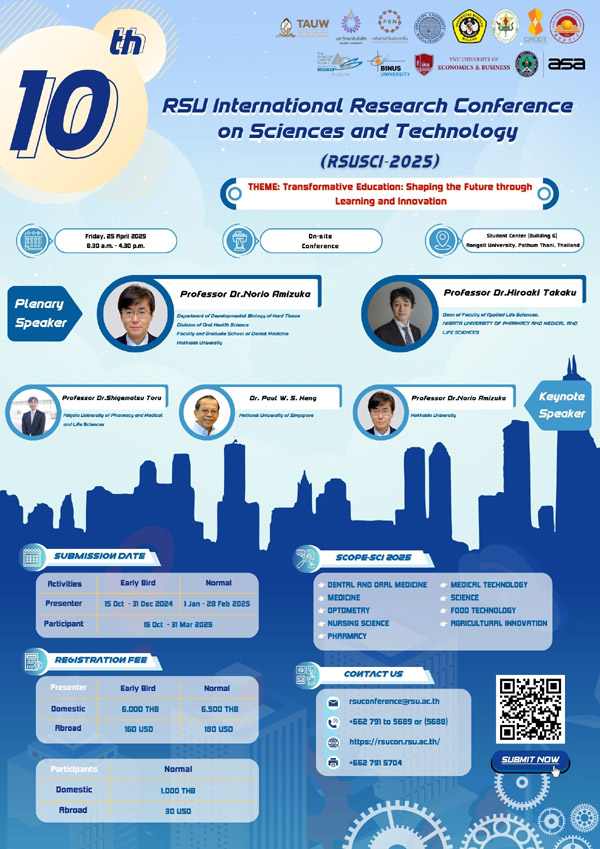 สถาบันวิจัย มหาวิทยาลัยรังสิต ขอเชิญเข้าร่วมงานประชุมวิชาการระดับนานาชาติ ครั้งที่ 10 (The 10th RSU International Research Coference (2025) ในหัวข้อ “Transformative Education: Shaping the Future through Learning and Innovation” ในวันศุกร์ที่ 25 เมษายน 2568 เวลา 08.30 – 16.30 น. ณ อาคาร Student center (อาคาร 6) ชั้น 2 มหาวิทยาลัยรังสิต สอบถามรายละเอียดเพิ่มเติม โทร. 0-2791-5686-91