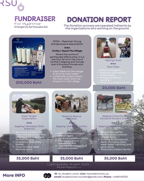 ทั้งนี้ กลุ่มนักศึกษาได้ทำการศึกษาข้อมูลและประเมินพื้นที่ที่ได้รับผลกระทบอย่างรอบคอบ เพื่อส่งมอบเงินช่วยเหลือให้กับองค์กรที่น่าเชื่อถือ และทำงานในพื้นที่โดยตรง รวมถึงชุมชนอื่น ๆ ที่ได้รับผลกระทบจากแผ่นดินไหวในไทยและพม่า ได้แก่ Myanmar Young Entrepreneurs Association (MYEA), Saplings Youth, Clean Yangon Organization, Myanmar Rescue Federation, Sagaing Univarsity of education student Union และองค์กรที่ดำเนินงานช่วยเหลือผู้ประสบภัยจากแผ่นดินไหว เขตจตุจักร กรุงเทพฯ