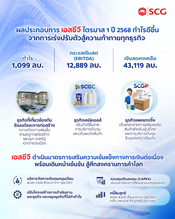 เอสซีจี เผยผลประกอบการไตรมาส 1 ปี 2568 ดีขึ้นกว่าไตรมาส 4 ปี 2567 กระแสเงินสด (EBITDA) แข็งแกร่งต่อเนื่อง 12,889 ล้านบาท กำไร 1,099 ล้านบาท จากการเร่งปรับตัวสู้ความท้าทายในทุกธุรกิจ และมาตรการเสริมความเข้มแข็งการเงินต่อเนื่อง พร้อมยกระดับ “4 กลยุทธ์”สู้ศึกสงครามการค้าโลกรุนแรงยืดเยื้อ 1.) ลดต้นทุน แข่งขันกับผู้ผลิตระดับโลก 2.) ขยายพอร์ตสินค้าให้รองรับความต้องการตลาดทุกระดับ ทั้ง “สินค้ามูลค่าเพิ่มสูง สินค้ากรีน และสินค้าคุณภาพ ราคาจับต้องได้” 3.) บุกตลาดใหม่ที่มีศักยภาพสูง 4.) สร้างความได้เปรียบโดยส่งออกจากฐานการผลิตที่หลากหลายในภูมิภาคอาเซียน มั่นใจธุรกิจมีเสถียรภาพเติบโตได้ท่ามกลางความท้าทาย