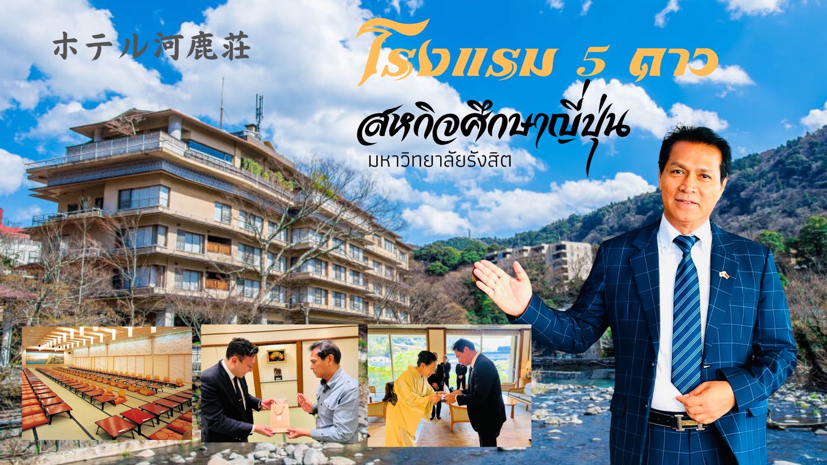 ฝ่ายญี่ปุ่นสัมพันธ์ มหาวิทยาลัยรังสิต นำโดย ดร.เชาว์ เต็มรักษ์ ผู้ช่วยอธิการบดีฝ่ายญี่ปุ่นสัมพันธ์มหาวิทยาลัยรังสิต เดินทางเยี่ยมชม และหารือความร่วมมือกับผู้ประกอบการโรงแรมกว่า 15 แห่งในประเทศญี่ปุ่น เพื่อขยายโอกาสด้านการเลือกฝึกงานสหกิจศึกษาให้แก่นักศึกษามหาวิทยาลัยรังสิต สำหรับการเดินทางหารือความร่วมมือในครั้งนี้ มหาวิทยาลัยรังสิต ได้รับการตอบรับจาก Kajikaso Ryokan เรียวกังสไตล์ญี่ปุ่นดั้งเดิมอายุกว่า 80 ปี (ผู้บริหารรุ่นที่ 4) ที่พร้อมเปิดบ้านต้อนรับนักศึกษามหาวิทยาลัยรังสิตจำนวน 3 คน เริ่มฝึกงานในเดือนมกราคม 2569