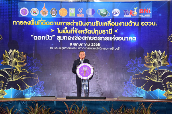 วันที่ 8 พฤษภาคม 2568 นายศุภชัย ใจสมุทร ผู้ช่วยรัฐมนตรีประจำกระทรวงการอุดมศึกษา วิทยาศาสตร์ วิจัยและนวัตกรรม (อว.) พร้อมด้วยคณะผู้บริหารกระทรวงฯ ลงพื้นที่ติดตามการขับเคลื่อนงานด้านการอุดมศึกษา วิทยาศาสตร์ วิจัยและนวัตกรรม หรือ อววน. ในพื้นที่จังหวัดปทุมธานี ในการนี้มี นายองค์รักษ์ ทองนิรมล รองผู้ว่าราชการจังหวัดปทุมธานี พลตำรวจโทคำรณวิทย์ ธูปกระจ่าง นายกองค์การบริหารส่วนจังหวัดปทุมธานี รองศาสตราจารย์ ดร.สมหมาย ผิวสอาด รักษาการในตำแหน่งอธิการบดีมหาวิทยาลัยเทคโนโลยีราชมงคลธัญบุรี รองศาสตราจารย์ ดร.เกียรติศักดิ์ แสงประดิษฐ์ ผู้อำนวยการสถาบันวิจัยและพัฒนา มหาวิทยาลัยเทคโนโลยีราชมงคลธัญบุรี พร้อมทั้งผู้บริหารหน่วยงานในสังกัดกระทรวงการอุดมศึกษาฯ หัวหน้าส่วนราชการในจังหวัดปทุมธานี อาจารย์ บุคลากร นักศึกษา และประชาชนในพื้นที่ ร่วมต้อนรับและเข้าร่วมกิจกรรมอย่างคับคั่ง ภายใต้แนวคิด “ดอกบัว ชุมทองของของเกษตรกร และอิเล็กทรอนิกส์อากาศยาน เพื่อการพัฒนาแห่งอนาคต” สะท้อนถึงอัตลักษณ์ของจังหวัดปทุมธานี และบทบาทของมหาวิทยาลัย ในการพัฒนาเทคโนโลยี นวัตกรรม และองค์ความรู้ เพื่อยกระดับเศรษฐกิจ และคุณภาพชีวิตของประชาชนในพื้นที่ ณ หอประชุม มหาวิทยาลัยเทคโนโลยีราชมงคลธัญบุรี