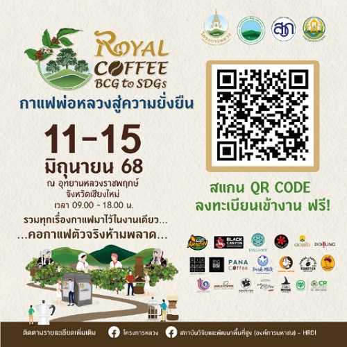 มูลนิธิโครงการหลวง ร่วมกับ สถาบันวิจัยและพัฒนาพื้นที่สูง (องค์การมหาชน) กรมวิชาการเกษตร และสำนักงานพัฒนาการวิจัยการเกษตร (องค์การมหาชน) กำหนดจัดงาน“กาแฟพ่อหลวงสู่ความยั่งยืน จาก BCG สู่ SDGs” ซึ่งจะจัดขึ้นระหว่างวันที่ 11 – 15 มิถุนายน 2568 ณ อุทยานหลวงราชพฤกษ์ จังหวัดเชียงใหม่