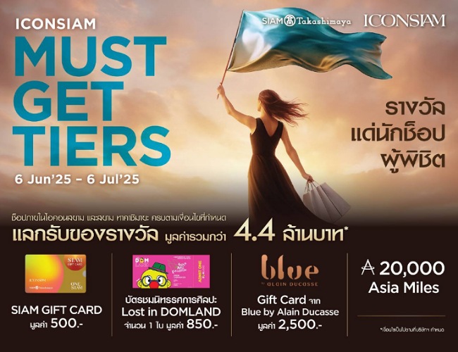 ช็อปสนุกแบบไม่มีสะดุด พร้อมแลกรับของรางวัลสุดคุ้มกับ “ICONSIAM MUST-GET-TIERS” ได้ที่ไอคอนสยาม และ สยาม ทาคาชิมายะ ตั้งแต่วันที่ 6 มิถุนายน 2568 – 6 กรกฎาคม 2568 ติดตามรายละเอียดเพิ่มเติมได้ที่ Facebook: ICONSIAM หรือโทร. 1338