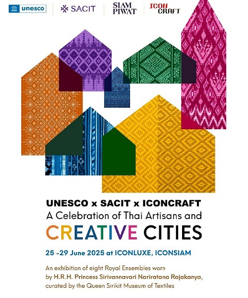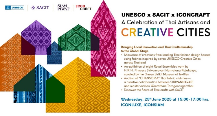 ยูเนสโก (UNESCO) และสถาบันส่งเสริมศิลปหัตถกรรมไทย (องค์การมหาชน) หรือ SACIT ร่วมกับ ไอคอนคราฟต์ (ICONCRAFT) พื้นที่แห่งแรงบันดาลใจ แหล่งรวมงานคราฟต์สร้างสรรค์จากช่างฝีมือไทย จัดแคมเปญพิเศษ “UNESCO x SACIT x ICONCRAFT : A Celebration of Thai Artisans and Creative Cities” เชิดชูช่างฝีมือไทยและร่วมสนับสนุนโครงการ Creative Cities Network เครือข่ายเมืองสร้างสรรค์ของยูเนสโก ยกระดับงานภูมิปัญญาท้องถิ่นจาก 7 จังหวัดเมืองสร้างสรรค์ ต้นแบบมรดกแห่งวัฒนธรรม และช่างฝีมือไทย สู่ผลงานหัตถศิลป์ร่วมสมัยจากการสร้างสรรค์ของ 14 สุดยอดดีไซเนอร์ไทยและแบรนด์ SIRIVANNAVARI เพื่อต่อยอดเป็นงานดีไซน์ใหม่ที่ยั่งยืน ส่งต่อแรงบันดาลใจให้กับคนรุ่นใหม่