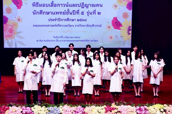 คณะแพทยศาสตร์ศรีสวางควัฒน ราชวิทยาลัยจุฬาภรณ์ จัด “พิธีมอบเสื้อกาวน์และปฎิญาณตน” นักศึกษาแพทย์ชั้นปีที่ 5 รุ่นที่ 2 ปีการศึกษา 2568 จำนวน 31 คน โดยมีศาสตราจารย์เกียรติคุณ นายแพทย์รัชตะ รัชตะนาวิน รักษาการรองเลขาธิการราชวิทยาลัยจุฬาภรณ์ เป็นประธานในพิธี พร้อมด้วย ศาสตราจารย์ แพทย์หญิงยุวเรศมคฐ์ สิทธิชาญบัญชา รักษาการรองเลขาธิการราชวิทยาลัยจุฬาภรณ์ รองศาสตราจารย์ นายแพทย์สุรศักดิ์ ลีลาอุดมลิปิ ผู้อำนวยการโรงพยาบาลจุฬาภรณ์ รองศาสตราจารย์ นายแพทย์ธีรภัทร อึ้งตระกูล รักษาการคณบดีคณะแพทยศาสตร์ศรีสวางควัฒน ผู้ช่วยศาสตราจารย์ นายแพทย์วิสุทธิ์ ล้ำเลิศธน รองคณบดีคณะแพทยศาสตร์ศรีสวางควัฒน นายแพทย์สุรชัย โชคครรชิตไชย ผู้อำนวยการโรงพยาบาลนครปฐม แพทย์หญิงนวพร พูลสุวรรณ รองผู้อำนวยการโรงพยาบาลเพชรบูรณ์ และคณะผู้บริหารจากคณะแพทยศาสตร์ศรีสวางควัฒน โรงพยาบาลจุฬาภรณ์ โรงพยาบาลนครปฐม และโรงพยาบาลเพชรบูรณ์ เข้าร่วมพิธีการ ณ อาคารคณะแพทยศาสตร์ศรีสวางควัฒน ราชวิทยาลัยจุฬาภรณ์ เขตหลักสี่ กรุงเทพมหานคร