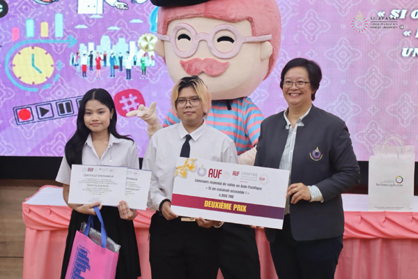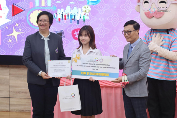 นักศึกษาสาขาวิชาภาษาฝรั่งเศส วิทยาลัยศิลปศาสตร์ มหาวิทยาลัยรังสิต คว้า 2 รางวัลจากการประกวดคลิปวิดีโอระดับชาติ และระดับภูมิภาคเอเชียแปซิฟิก โดยได้รับเกียรติจาก Dr. TRAN Van Cong ผู้อำนวยการศูนย์ความร่วมมือนานาชาติของกลุ่มประเทศผู้ใช้ภาษาฝรั่งเศส ประจำภูมิภาคเอเชียแปซิฟิก(CREFAP/OIF) และ ผู้ช่วยศาสตราจารย์ ดร. ปิยสุดา ม้าไว คณบดีวิทยาลัยศิลปศาสตร์ มหาวิทยาลัยรังสิต เป็นผู้มอบเกียรติบัตรและของรางวัลแก่ผู้ชนะการแข่งขัน ณ ห้อง 6-200 อาคาร Student Center (อาคาร 6) มหาวิทยาลัยรังสิต
