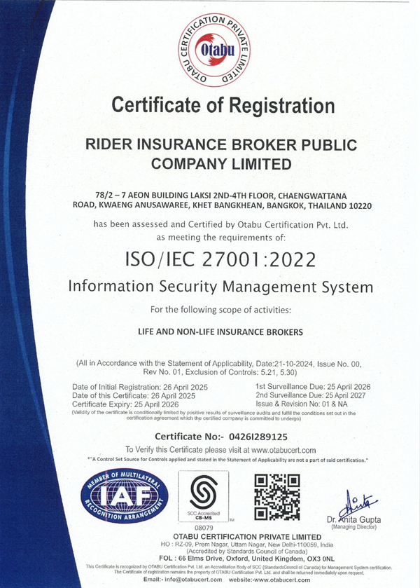 บริษัท ไรเดอร์ อินชัวรันส์ โบรกเกอร์ จำกัด (มหาชน) ได้รับการรับรองมาตรฐาน ISO/IEC 27001:2022 สำหรับระบบบริหารจัดการความมั่นคงปลอดภัยสารสนเทศ (Information Security Management System: ISMS) ที่ได้รับจากสถาบันรับรองคุณภาพมาตรฐานสากล Otabu Global Services Pvt.Ltd. ประเทศอินเดีย ที่ครอบคลุมทั้งธุรกิจนายหน้าประกันชีวิตและนายหน้าประกันวินาศภัย ซึ่งสะท้อนถึงความมุ่งมั่นของบริษัทในการเสริมสร้างความเชื่อมั่นด้านการรักษาความลับ ความครบถ้วน และความปลอดภัยของข้อมูลในทุกกระบวนการ