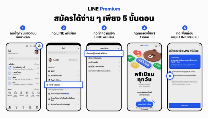 สมัคร LINE Premium ได้แล้ววันนี้ ทดลองใช้ฟรี 1 เดือน ได้ที่ https://lin.ee/C40rCpG/wcvn (กดผ่านมือถือเท่านั้น) หรือไปยังแถบ “หน้าหลัก” ในแอปฯ LINE เลือก “ตั้งค่า” เลือก “LINE Premium” และเลือก “ทำความรู้จัก LINE Premium” เพื่อกดยอมรับข้อกำหนดให้เรียบร้อย และกด “ทดลองใช้ฟรี 1 เดือน” โดยจะทำการเชื่อมต่อกับระบบชำระเงินผ่าน App Store หรือ Google Play ผู้สนใจ สามารถเพิ่มบัญชีทางการเพื่อรับข่าวสารล่าสุดจาก LINE Premium ได้แล้วที่ @line_premium_th