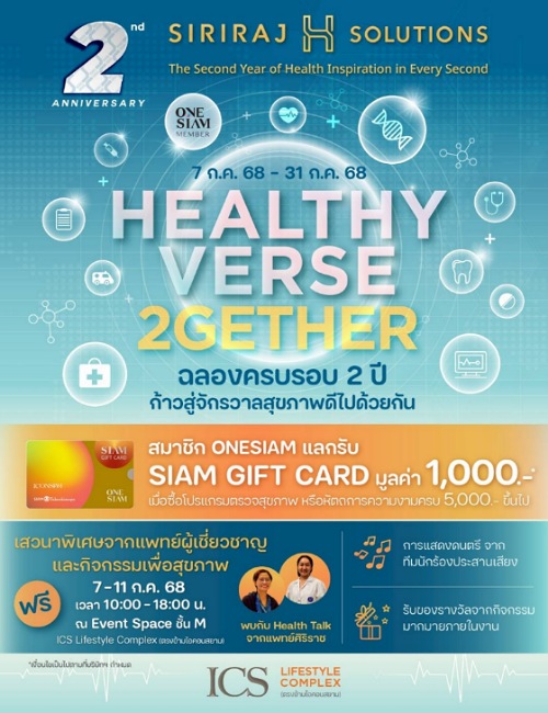 นอกจากนี้ เพื่อร่วมฉลองให้กับความสำเร็จในปีที่ 2 ก้าวสู่ปีที่ 3 ของ SIRIRAJ H SOLUTIONS ไอซีเอส ยังมอบโปรโมชั่นพิเศษสุดเอ็กคลูซีฟ “The 2nd Anniversary Healthy Verse 2Gether” ให้สมาชิก ONESIAM ที่ซื้อโปรแกรมตรวจสุขภาพหรือหัตถการความงาม และนวดไทยแบบราชสำนัก กับ SIRIRAJ H SOLUTIONS ครบ 5,000 บาทขึ้นไป แลกรับ SIAM GIFT CARD มูลค่า 1,000 บาท ได้ทันที จำนวน 100 สิทธิ์ตลอดรายการ รวมมูลค่า 100,000 บาท ตั้งแต่วันที่ 7 – 31 กรกฎาคม 2568 ติดตามเงื่อนไขการรับรางวัลได้ที่เฟสบุ๊ก ICS