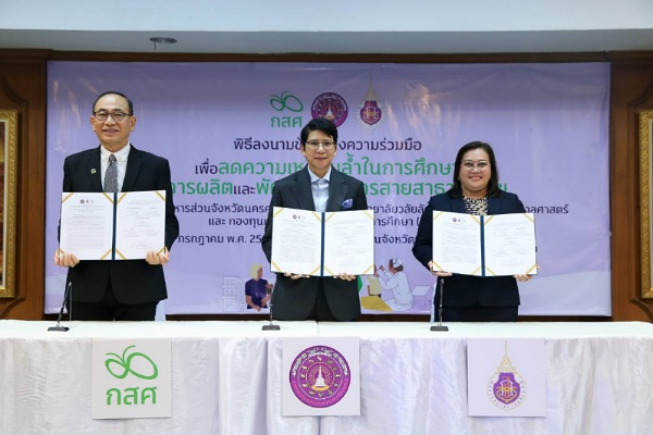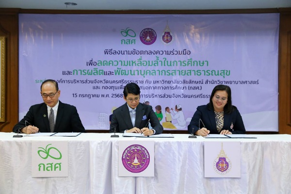 ผู้ช่วยศาสตราจารย์ ดร.อรเพ็ญ สุขะวัลลิ คณบดีสำนักวิชาพยาบาลศาสตร์ มหาวิทยาลัยวลัยลักษณ์ (มวล.) นายไกรยส ภัทราวาท ผู้จัดการกองทุนเพื่อความเสมอภาคทางการศึกษา (กสศ.) และนางสาววาริน ชิณวงศ์ นายกองค์การบริหารส่วนจังหวัดนครศรีธรรมราช (อบจ.) ลงนามในบันทึกข้อตกลงความร่วมมือ“เพื่อลดความเหลื่อมล้ำในการศึกษาและการผลิตและพัฒนาบุคลากรสายสาธารณสุข จังหวัดนครศรีธรรมราช” ร่วมกับ โดยมีผู้บริหารและเจ้าหน้าที่ของทั้ง 3 หน่วยงานร่วมเป็นสักขีพยาน ณ ห้องประชุม อบจ.นครศรีฯ เมื่อวันที่ 15 กรกฏาคม 2568 ที่ผ่านมา