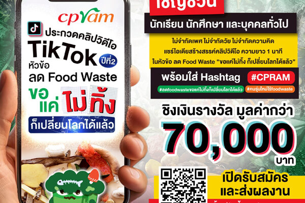 บริษัท ซีพีแรม จำกัด (CPRAM) ผู้นำด้านอุตสาหกรรมอาหารพร้อมรับประทาน สานต่อเจตนารมณ์การพัฒนาสังคมอย่างยั่งยืน เดินหน้าภารกิจเพื่อสิ่งแวดล้อมอย่างต่อเนื่อง จัดกิจกรรมประกวดคลิปวิดีโอ TikTok ความยาว 1 นาที ภายใต้หัวข้อ “ขอแค่ไม่ทิ้ง ก็เปลี่ยนโลกได้แล้ว” เปิดพื้นที่ให้ประชาชนทั่วไปได้ร่วมเป็นส่วนหนึ่งในการสร้างความเปลี่ยนแปลงผ่านแนวคิดลดขยะอาหาร (Food Waste) อย่างง่าย ๆ ได้ด้วยตัวคุณเอง พร้อมชิงเงินรางวัลรวมกว่า 70,000 บาท พร้อมใบประกาศเกียรติคุณ เปิดรับสมัครและส่งผลงานได้ตั้งแต่วันนี้ – 30 กันยายน 2568