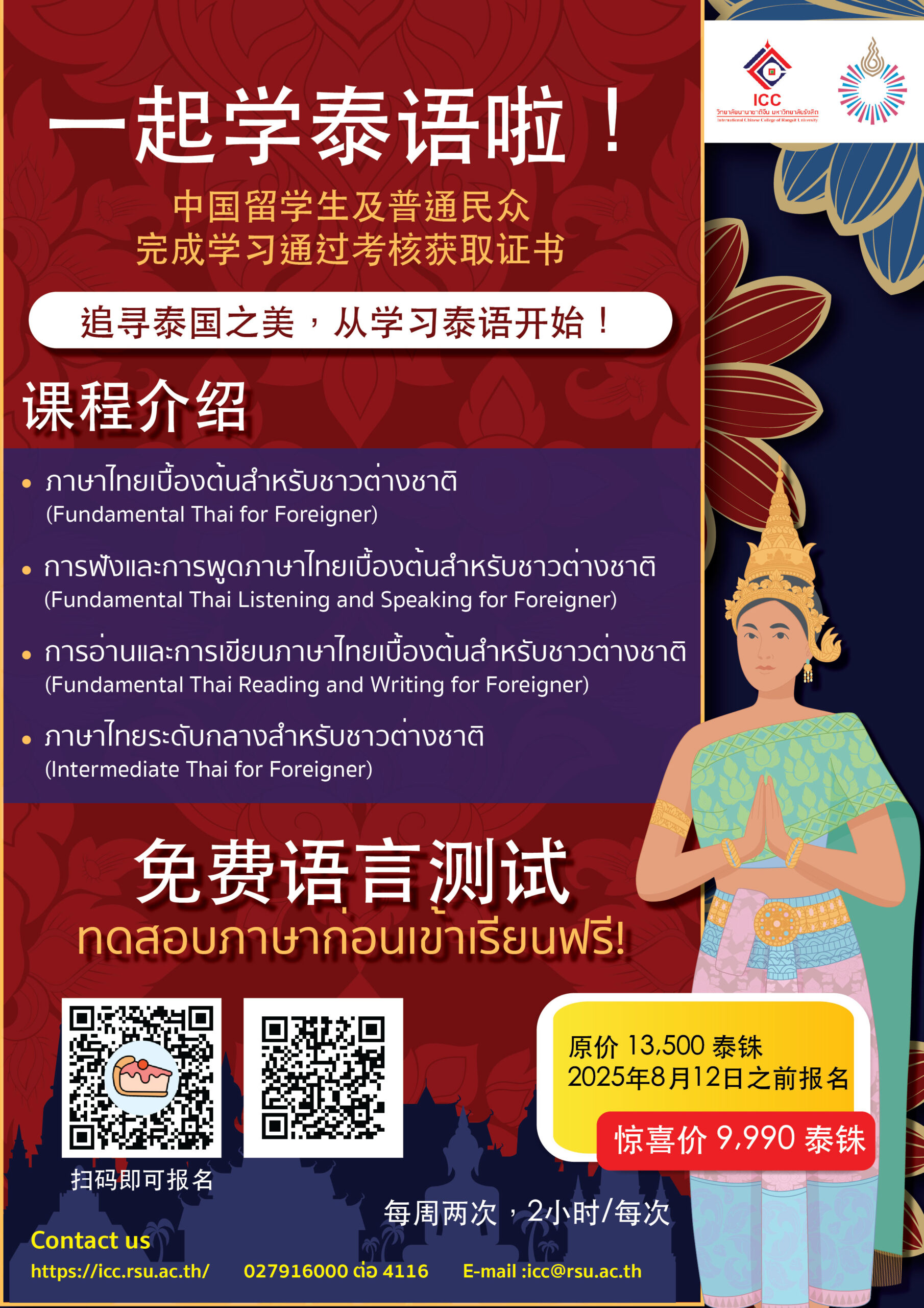 วิทยาลัยนานาชาติจีน มหาวิทยาลัยรังสิต จัดอบรม “หลักสูตรโครงการสอนภาษาไทย สำหรับคนจีนและบุคคลทั่วไป” รุ่นที่ 4 ทั้งนี้ ระยะเวลาในการเรียนจำนวน 45 ชั่วโมง เริ่มเรียนทุกวันอังคาร และวันพฤหัสบดี เวลา 17.00-19.00 น. ตั้งแต่วันที่ 19 สิงหาคม 2568 – 4 พฤศจิกายน 2568 เมื่อเรียนจบคอร์ส และสอบผ่าน ผู้เข้าเรียนจะได้รับประกาศนียบัตร รายละเอียดเนื้อหาการเรียนจะเน้นเรื่องของการสื่อสาร อาทิ ภาษาไทยเบื้องต้นสำหรับชาวต่างชาติ (Fundamental Thai for Foreigner) การฟังและการพูดภาษาไทยเบื้องต้นสำหรับชาวต่างชาติ (Fundamental Thai Listening and Speaking for Foreigner) การอ่านและการเขียนภาษาไทยเบื้องต้นสำหรับชาวต่างชาติ (Fundamental Thai Reading and Writing for Foreigner) และ ภาษาไทยระดับกลางสำหรับชาวต่างชาติ (Intermediate Thai for Foreigner)