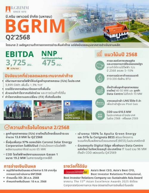 ดร. ฮาราลด์ ลิงค์ ประธานเจ้าหน้าที่บริหารกลุ่ม บริษัท บี.กริม เพาเวอร์ จำกัด (มหาชน) หรือ BGRIM เปิดเผยว่า ผลประกอบการไตรมาสที่ 2/2568 มีกำไรสุทธิจากการดำเนินงาน (NNP) – ส่วนที่เป็นของบริษัทใหญ่ 475 ล้านบาท และงวด 6 เดือน อยู่ที่ 1,224 ล้านบาท สำหรับ EBITDA อยู่ที่ 3,732 ล้านบาท ลดลงจากปีก่อน 4.7% และช่วง 6 เดือน ลดลงจากปีก่อน 1.2% ขณะที่มีกำไรสุทธิ – ส่วนที่เป็นของบริษัทใหญ่อยู่ที่ 7 ล้านบาท ลดลงจาก 229 ล้านบาทในช่วงเดียวกันของปีก่อน โดยได้รับผลกระทบจากการชำระคืนค่าก๊าซย้อนหลัง (AF gas cost) ช่วงเดือนกันยายน – ธันวาคม 2566 รวมถึงค่าใช้จ่ายภาษีที่สูงขึ้น รวมถึงผลขาดทุนจาก FX ที่ยังไม่เกิดขึ้นจริง (เป็นรายการที่ไม่กระทบกระแสเงินสดจากการแปลงมูลค่ายอดหนี้คงเหลือสกุลดอลลาร์สหรัฐ และสกุลต่างประเทศอื่นๆ ด้วยอัตราแลกเปลี่ยน ณ วันสิ้นงวด)