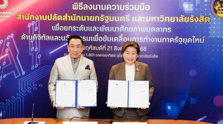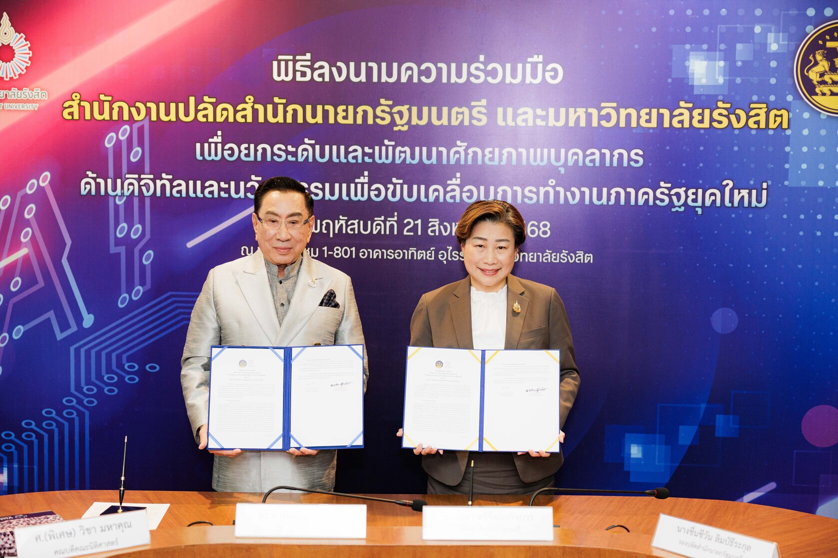 มหาวิทยาลัยรังสิต (มรส.) ร่วมกับ สำนักงานปลัดสำนักนายกรัฐมนตรี (สปน.) จัดพิธีลงนามบันทึกข้อตกลงความร่วมมือ (MOU) ว่าด้วยการยกระดับและพัฒนาศักยภาพบุคลากรด้านดิจิทัลและนวัตกรรม เพื่อขับเคลื่อนการทำงานภาครัฐยุคใหม่ โดยมี นางยุพา ทวีวัฒนะกิจบวร ปลัดสำนักนายกรัฐมนตรี และ ดร.อาทิตย์ อุไรรัตน์ อธิการบดีมหาวิทยาลัยรังสิต เป็นผู้แทนร่วมลงนาม ความร่วมมือครั้งนี้มีเป้าหมายเพื่อสร้างเครือข่ายทางวิชาการ การอบรมเชิงปฏิบัติการ การศึกษาวิจัย และการสร้างนวัตกรรม โดยมุ่งเน้นการนำเทคโนโลยีปัญญาประดิษฐ์ (AI) มาประยุกต์ใช้ในการสร้างเนื้อหาและการสื่อสารที่ทันสมัย พร้อมทั้งเผยแพร่ความรู้ด้านการป้องกันการทุจริต เพื่อส่งเสริมวัฒนธรรมองค์กรที่โปร่งใส และสร้างประโยชน์สูงสุดแก่ประชาชน การลงนาม MOU ในครั้งนี้นับเป็นก้าวสำคัญในการพัฒนาทักษะบุคลากรภาครัฐด้านดิจิทัลและนวัตกรรม โดยใช้ AI เป็นกลไกขับเคลื่อนสู่การทำงานภาครัฐยุคใหม่อย่างแท้จริง