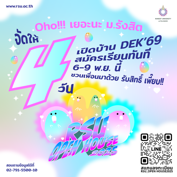 มหาวิทยาลัยรังสิต เปิดบ้านต้อนรับน้องๆ มัธยศึกษาตอนปลาย สายวิทย์ ศิลป์ ภาษา รวมถึงอาชีวศึกษาร่วมกิจกรรมงาน Open House 2025 : Oho!! เยอะนะ ม.รังสิต พบกับกิจกรรมพาทัวร์แบบจัดเต็ม 4 วัน ทุกวิทยาลัย/คณะ/สาขา 8 กลุ่มการศึกษา 143 หลักสูตร พูดคุยปรึกษาการเรียน ไลฟสไตล์ รวมถึงร่วมสนุกกับกิจกรรมที่จะสร้างประสบการณ์ชีวิต ค้นหาตัวตน ค้นหาทุนการศึกษา และมาออกแบบการเรียนแบบที่ชอบเพื่ออาชีพในอนาคตกัน งานนี้น้อง ๆ สามารถเข้าเยี่ยมชมได้ทุกคณะโดยไม่มีค่าใช้จ่าย กิจกรรมจัดขึ้นระหว่างวันที่ 6 – 9 พฤศจิกายน 2568 เวลา 8.00 น. เป็นต้นไป นอกจากนี้สำหรับผู้ที่สมัครเรียน ป.ตรี รับทุน Early Bird 15,000 บาท ตั้งแต่วันนี้ถึง 31 มกราคม 2569 อีกด้วย สอบถามรายละเอียดเพิ่มเติม โทร. 0-2791-5500-10 หรือลงทะเบียนได้ที่ https://www.rsu.ac.th/