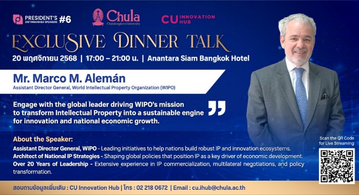 จุฬาลงกรณ์มหาวิทยาลัยขอเชิญชวนบุคคลทั่วไป ผู้สนใจด้านนวัตกรรม และบุคลากรในระบบนิเวศธุรกิจนวัตกรรม เข้าร่วมรับชมการถ่ายทอดสด (Live Streaming) งาน “President’s Distinguished Speaker” ครั้งที่ 6 เพื่อเปิดมุมมองและรับฟังแนวคิดจากสองผู้นำระดับโลกด้านนวัตกรรม และทรัพย์สินทางปัญญาที่จะมาร่วมแบ่งปันประสบการณ์การพัฒนาระบบนิเวศนวัตกรรมและการจัดการทรัพย์สินทางปัญญาในระดับสากล