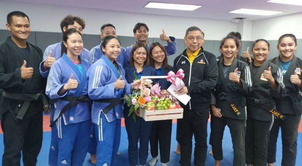 จากนั้นเดินทางไปเยี่ยมชมการฝึกซ้อมของนักกีฬายูยิตสูที่สนามซ้อมของสมาคมฯชั้นล่างสนามราชมังคลากีฬาสถาน ซึ่งนักกีฬายูยิตสูทีมชาติไทยเพิ่งเสร็จสิ้นภารกิจการแข่งขันยูยิตสูชิงแชมป์โลก ที่ประเทศไทยเป็นเจ้าภาพระหว่างวันที่ 1-15 พ.ย.ที่ผ่านมาด้วยผลงานคว้า 6 เหรียญทองในประเภทประชาชน ซึ่งเป็นนักกีฬาชุดเตรียมซีเกมส์ ครั้งที่ 33 โดยมี รศ.ดร.ชาญชัย สุขสุวรรณ์ นายกสมาคมกีฬายูยิตสูแห่งประเทศไทย ผู้ฝึกสอนและนักกีฬายูยิตสูทีมชาติไทยให้การต้อนรับ