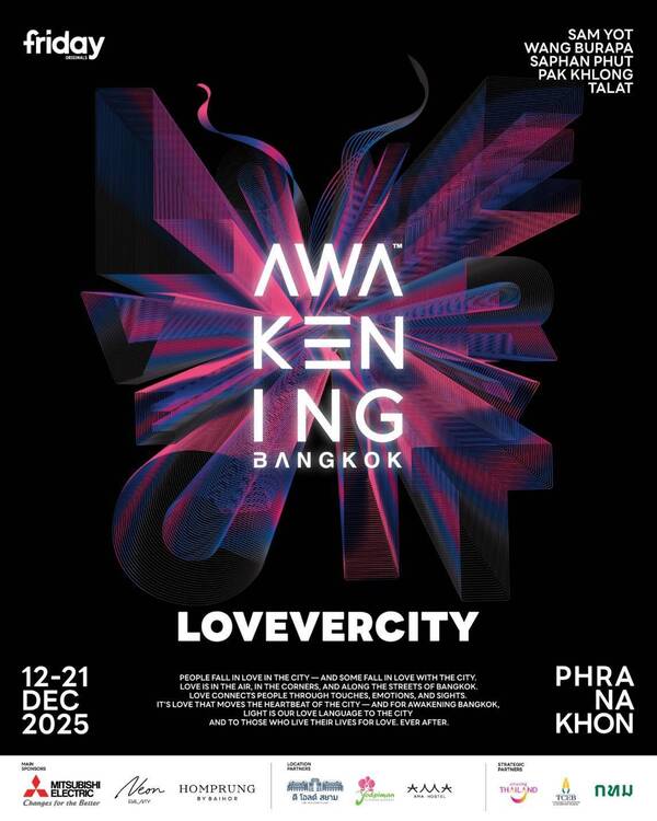 เทศกาลแสงไฟและศิลปะดิจิทัลแห่งกรุงเทพมหานคร “Awakening Bangkok 2025” เปิดให้เข้าชมฟรี! มาร่วมสัมผัสแสงสี เติมแรงบันดาลใจ และจุดประกายความคิดสร้างสรรค์ไปกับแสงไฟและศิลปะดิจิทัล ที่จะเปลี่ยนย่านเก่าให้เต็มไปด้วยชีวิตชีวา ระหว่างวันที่ 12 – 21 ธันวาคมนี้ ตั้งแต่เวลา 18:00 น. – 23:00 น. ใน 4 พื้นที่หลัก ปากคลองตลาด, สะพานพุทธ, วังบูรพา และสามยอด สามารถเดินทางได้สะดวกด้วยรถไฟฟ้าใต้ดิน MRT (สถานีสนามไชยและสถานีสามยอด) พร้อมบริการรถตุ๊ก ๆ รับส่งฟรี ดูรายละเอียดเพิ่มเติมและติดตามความเคลื่อนไหวต่าง ๆ ได้ที่ Facebook: Awakening Festivals Instagram: @AwakeningFestivals และ TikTok: @AwakeningFestivals