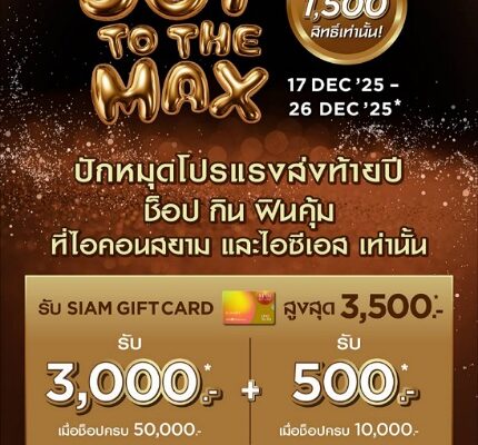 ไอคอนสยาม และไอซีเอส ไลฟ์สไตล์ คอมเพล็กซ์ กระตุ้นการจับจ่ายในช่วงเทศกาลส่งท้ายปี ด้วยการมอบของขวัญสุดพิเศษผ่านโปรโมชั่นแคมเปญ “JOY TO THE MAX” ให้ลูกค้าเอนจอยกับความสุขขั้นสุด รับ Siam Gift Card ทุกวัน สูงสุด 3,500 บาทต่อท่าน รวมมูลค่ากว่า 3 ล้านบาท