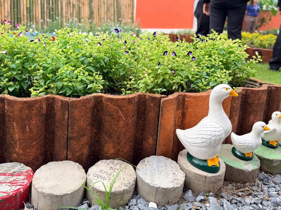 ใช้กระเบื้องเก่าและวัสดุเหลือใช้มาประยุกต์เป็นโครงสร้างสวนและแปลงปลูก แสดงให้เห็นว่า “สิ่งที่คิดว่าหมดค่าแล้ว ยังสร้างประโยชน์ได้” ในเชิงรูปธรรม