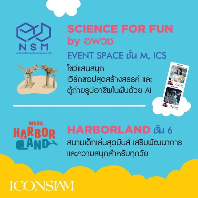 มาเรียนรู้ควบคู่กับความสนุกไปกับ “SCIENCE FOR FUN” หลากหลายกิจกรรมเชิงวิทยาศาสตร์ที่สร้างสรรค์โดย องค์การพิพิธภัณฑ์วิทยาศาสตร์แห่งชาติ (อพวช.) ทั้ง “Bozo Science Show” เวทีความรู้ด้านวิทยาศาสตร์ที่เปิดโอกาสให้เด็ก ๆ ได้ร่วมทดลองทางวิทยาศาสตร์ไปกับตัวตลกโบโซ่ จัดเต็มทั้งสาระและเสียงหัวเราะไปพร้อมกันทุกวันตลอดงาน วันละ 3 รอบ เวลา 11.00 น., 14.00 น. และ 17.00 น. นอกจากนี้ยังมี Workshop “SCIENCE FOR FUN” กิจกรรมแสนสนุกที่ให้น้อง ๆ ได้ลงมือสรรค์ผลงานด้วยตัวเอง พร้อมเรียนรู้หลักวิทยาศาสตร์แบบเข้าใจง่าย แถมได้ของน่ารัก ๆ กลับบ้าน จัดวันละ 2 รอบ เวลา 12.00-13.30 น. และ 15.00-16.30 น. และที่พลาดไม่ได้คือ “AI Photo Booth จุดประกายอาชีพในฝัน” ที่เด็ก ๆ เลือกอาชีพในฝัน ไม่ว่าจะเป็น นักบินอวกาศ นักวิทยาศาสตร์ คุณหมอ ศิลปิน นักบิน คุณครู ฯลฯ แล้วให้ AI ช่วยสร้างภาพของน้อง ๆ ในบทบาทนั้น ๆ เพื่อเก็บไว้เป็นที่ระลึกและสร้างแรงบันดาลใจให้เดินตามฝันในอนาคต โดยทุกกิจกรรมเปิดให้ร่วมสนุกระหว่างวันที่ 7-11 มกราคม 2569 ณ EVENT SPACE ชั้น M, ICS
