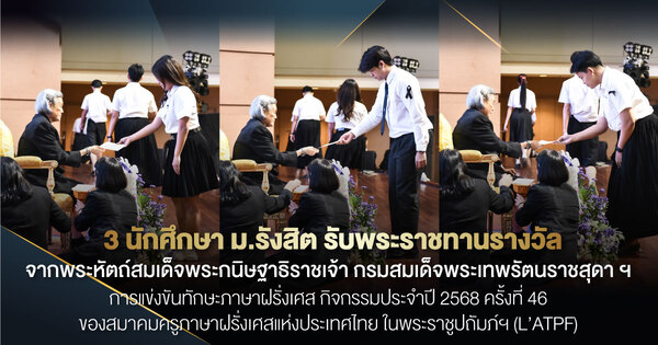 นักศึกษาสาขาวิชาภาษาฝรั่งเศส วิทยาลัยศิลปศาสตร์ และวิทยาลัยการออกแบบ มหาวิทยาลัยรังสิต รับพระราชทานรางวัลจากพระหัตถ์สมเด็จพระกนิษฐาธิราชเจ้า กรมสมเด็จพระเทพรัตนราชสุดา ฯ จากการแข่งขันทักษะภาษาฝรั่งเศส กิจกรรมประจำปี 2568 ครั้งที่ 46 ของสมาคมครูภาษาฝรั่งเศสแห่งประเทศไทย ในพระราชูปถัมภ์ฯ (L’ATPF) จัดโดยสมาคมครูภาษาฝรั่งเศสแห่งประเทศไทย ในพระราชูปถัมภ์สมเด็จพระกนิษฐาธิราชเจ้า กรมสมเด็จพระเทพรัตนราชสุดา ฯ สยามบรมราชกุมารี (สคฝท.) โดยได้รับรางวัลจากการแข่งขัน 3 รายการ ดังนี้