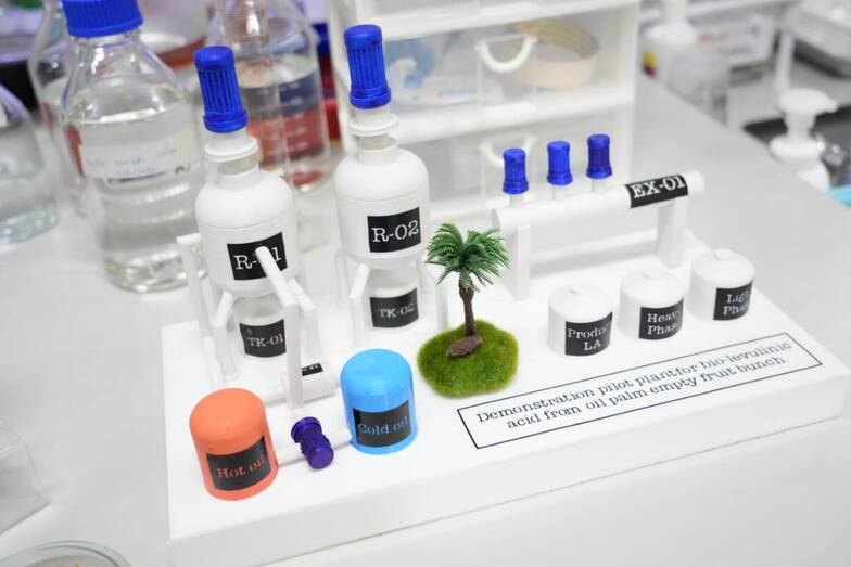 ผศ.ดร.ลิตวดี เจือบุญ เปิดเผยว่า ปัจจุบันประเทศไทยมีทะลายปาล์มเปล่าเหลือทิ้งในระบบกว่า 8,000 ตันต่อปี ซึ่งมีราคาตกต่ำเพียงกิโลกรัมละ 0.1 บาท อีกทั้งการกำจัดด้วยวิธีการเผายังก่อให้เกิดมลพิษทางอากาศ ขัดแย้งกับเป้าหมายการลดการปล่อยก๊าซเรือนกระจกเป็นศูนย์ Net Zero ของประเทศ ทีมวิจัยจึงได้ประยุกต์ใช้แนวคิดเศรษฐกิจชีวภาพ หมุนเวียน และสีเขียว BCG Model พัฒนา ‘เครื่องปฏิกรณ์แบบพิเศษ’ ร่วมกับกระบวนการสกัดสารเคมีแบบ 2 ขั้นตอนที่มีประสิทธิภาพสูง โดยสามารถเปลี่ยนทะลายปาล์มเปล่า 6.7 กิโลกรัม ให้เป็นกรดลิวูลินิกมูลค่าสูงได้ถึง 1 กิโลกรัม